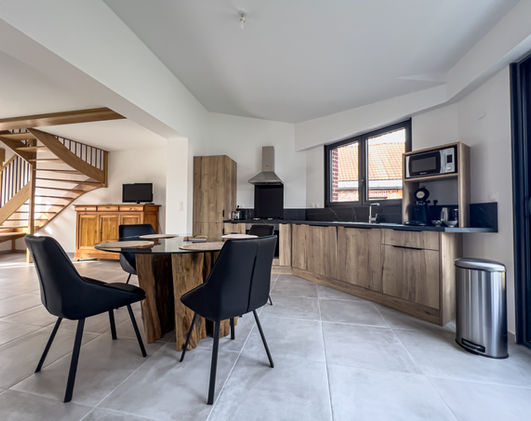 - 1 pièce de vie ouverte composée d'1 cuisine équipée, d'1 salon et d'1 salle à manger